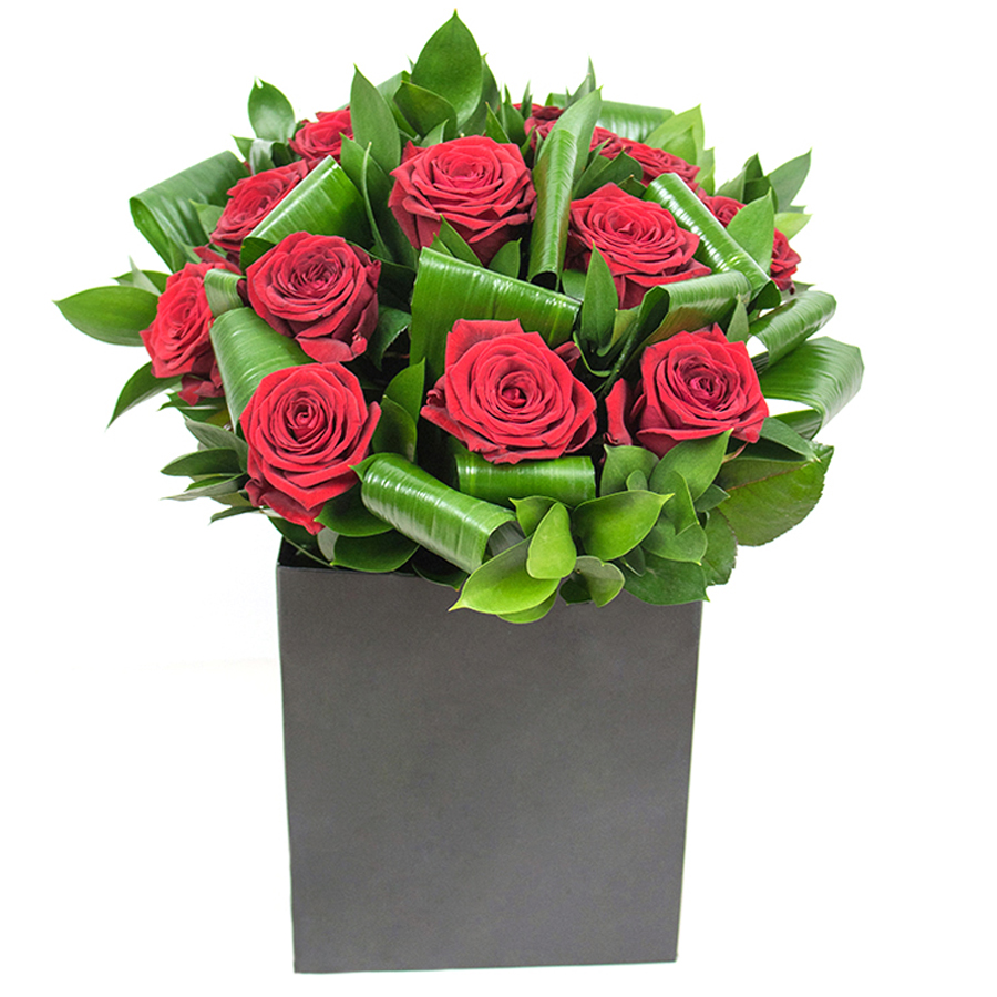 Introduce elegance with our beautiful red rose composition, combining lush red roses, vibrant aspidistra leaves, and graceful ruscus. This unique arrangement is designed to enrich any living space.